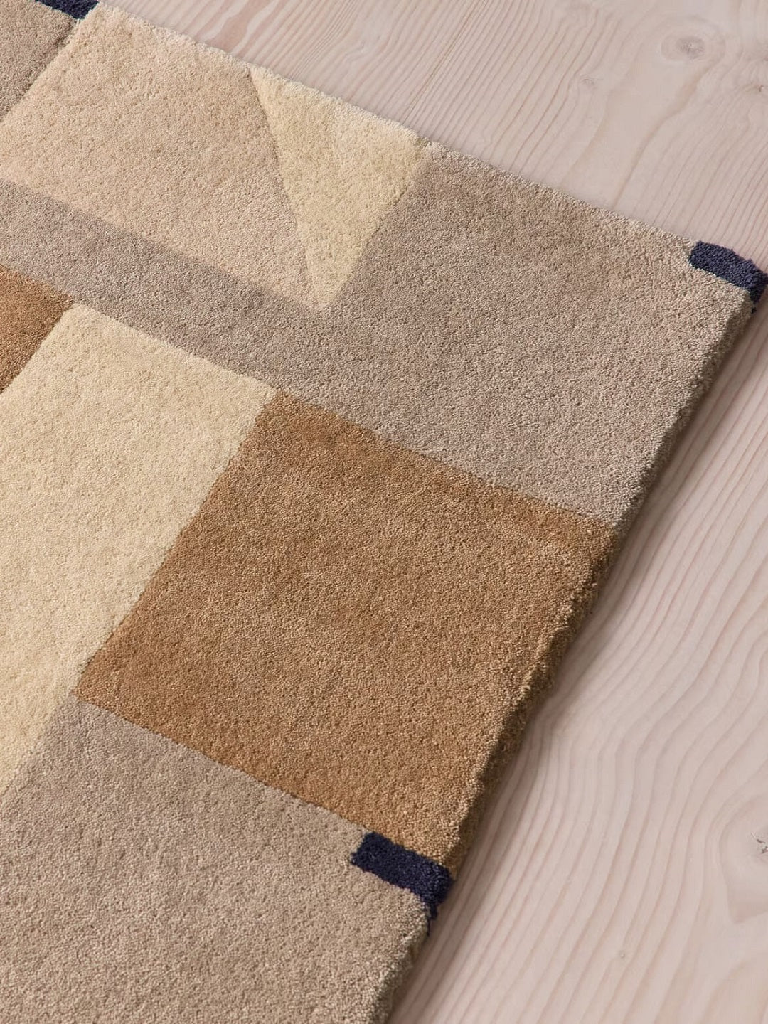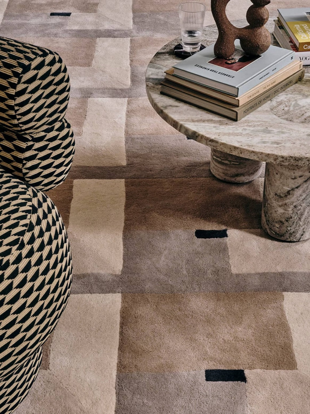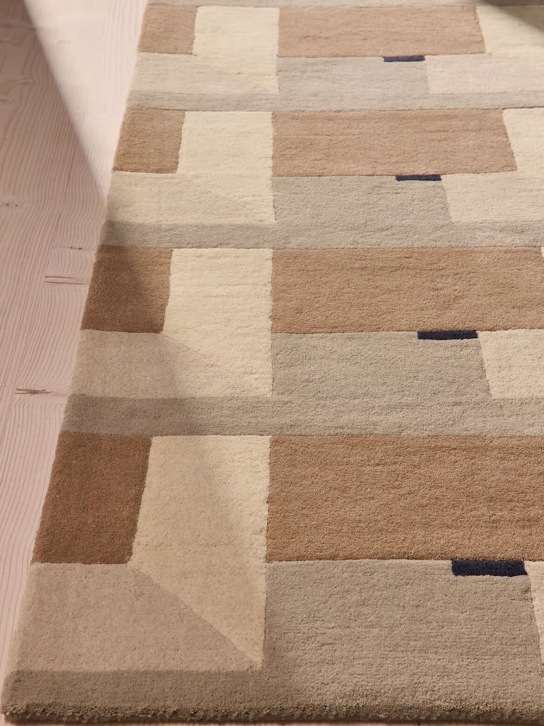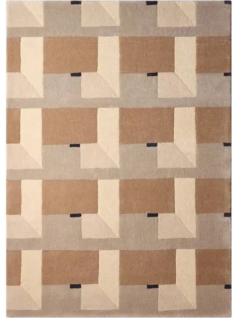 The rug features a contemporary geometric block pattern arranged in soothing neutral tones of beige, taupe, warm brown, and soft grey. The clean architectural layout adds subtle depth and dimension, making it a perfect choice for modern, minimalist, and sophisticated interiors.