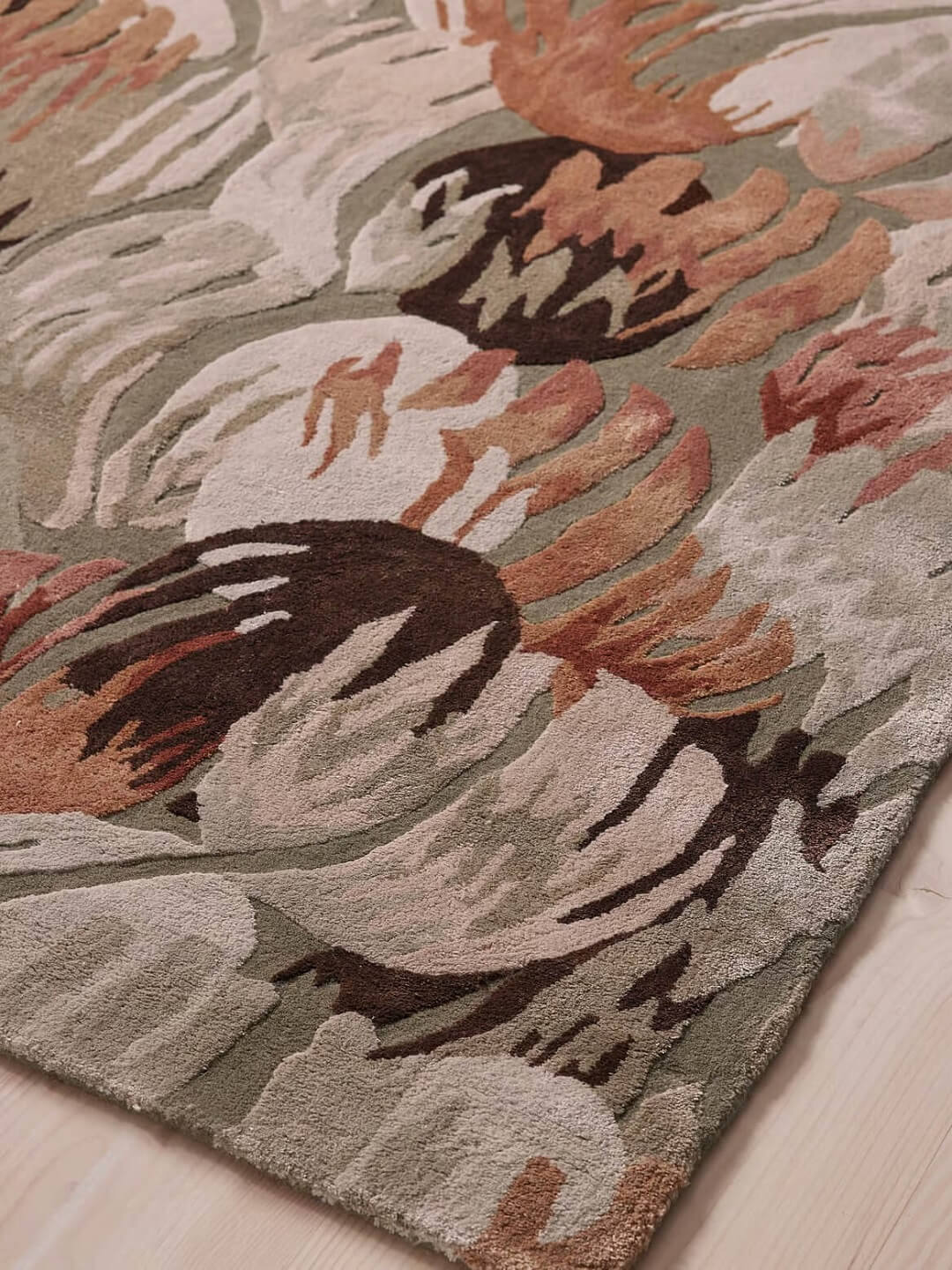 The rug features a beautiful abstract floral composition inspired by organic, flowing forms, rendered in a sophisticated palette of sage green, blush, taupe, chocolate brown, and soft ivory. The layered brushstroke-style pattern creates depth, movement, and visual richness, making it a striking centerpiece for modern, contemporary, and luxury interiors.