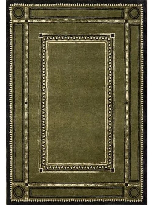 The design features a classic framed border layout with intricate dotted and linear detailing, beautifully executed in a deep olive green base with soft ivory and black contrast accents. This timeless composition blends traditional inspiration with modern luxury, making it ideal for formal living rooms, elegant bedrooms, boutique hotels, and premium residential interiors.