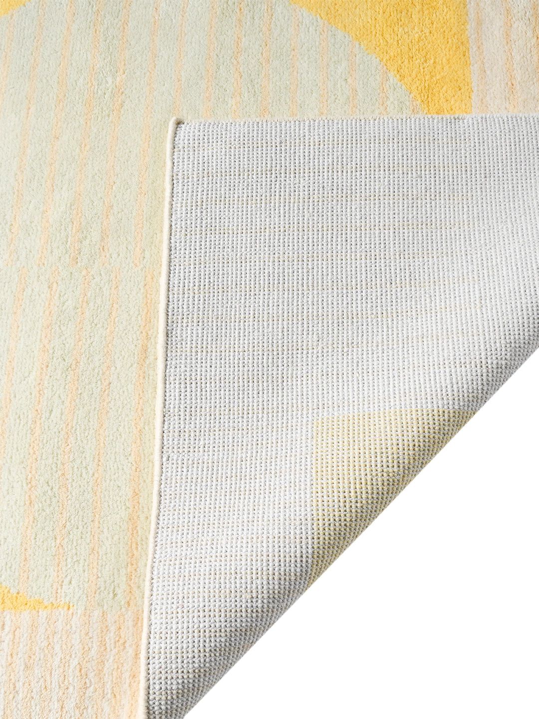 Elevate your living space with this exquisitely hand-knotted rug, crafted by skilled artisans using 100% premium New Zealand wool. Featuring a refined contemporary geometric design, the rug blends soft ivory, muted sage, and warm golden hues to create a calm yet sophisticated aesthetic.